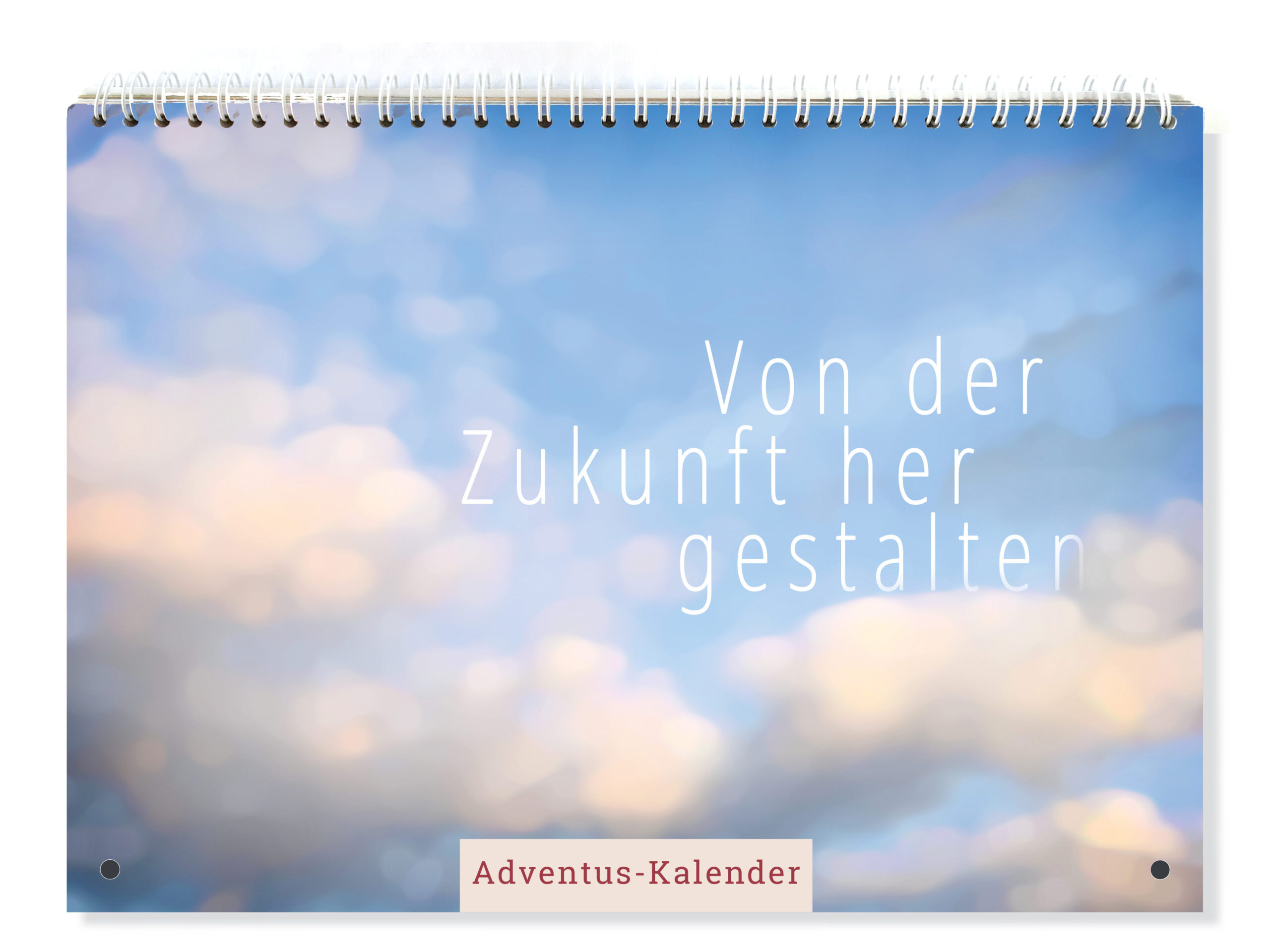 Ein Wandkalender mit 90 Seiten im Format 210 x 297 mm, gebunden mit einer Spiralbindung, an zwei Ecken gelocht zur Aufhängung, aufgeschlagen im Format 420 x 297 mm.
