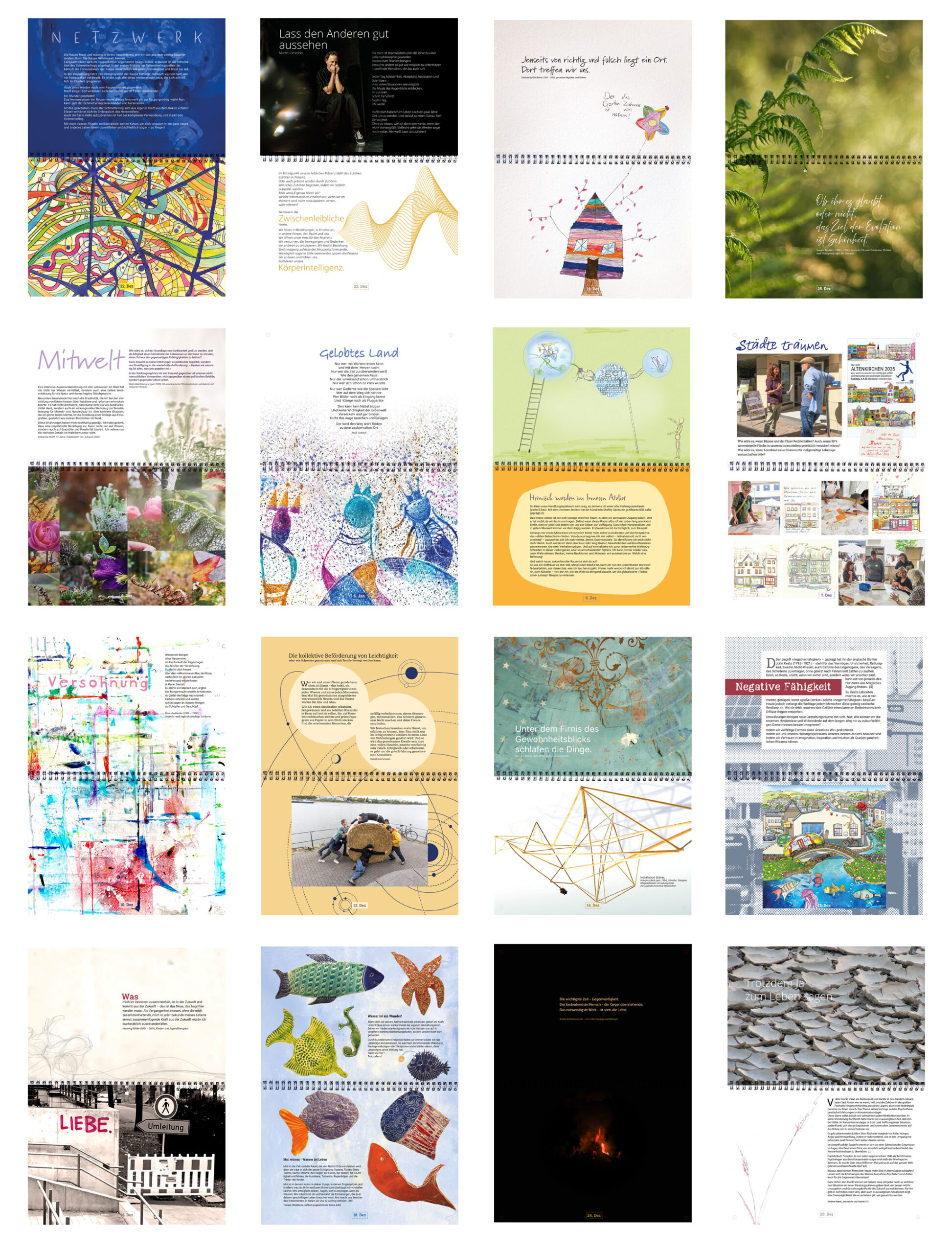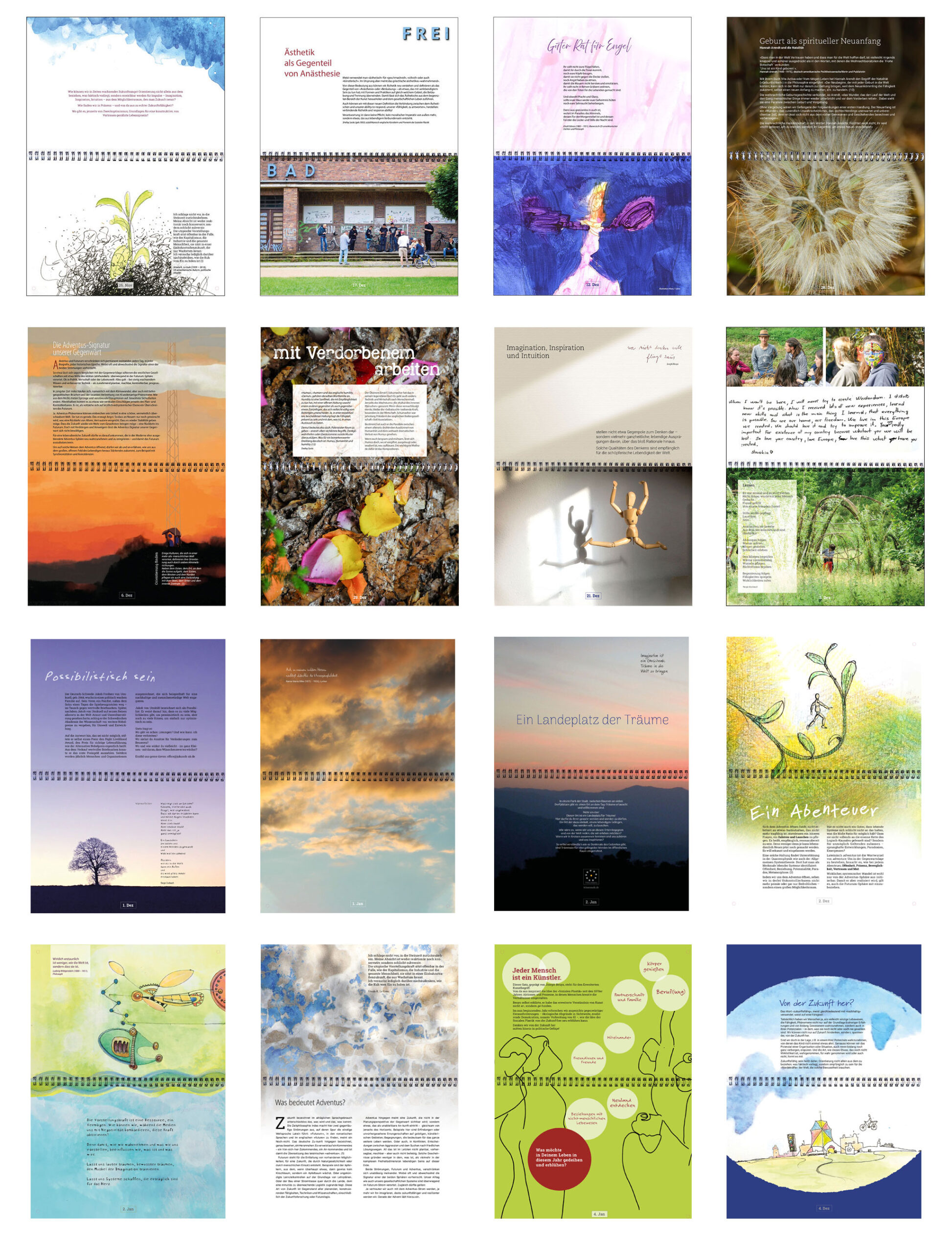 Der Adventus Kalender ist mehrjährig angelegt. Damit verweist er auf eine nicht mehr nur lineare Zeitqualität. Er dokumentiert zugleich die Arbeit der JuKusch Altenkirchen in 2024/2025 – ermöglicht durch eine Förderung des Fonds Soziokultur. In Anlehnung an Joseph Beuys trug unser Förderantrag den Titel »Wer nicht denken will fliegt raus.«